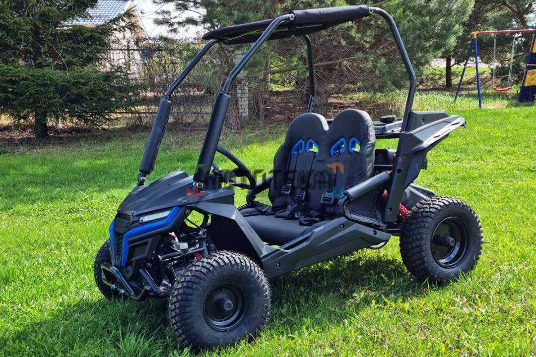 Машинка предназначена для детей 5-9 лет с ростом от 115 до 145см. Двигатель с объемом 163 куб. см и мощностью 7 л. с. пускай и не хватает звезд с неба по скорости, но по тяге он даст фору многим. Эластичный и тяговитый, он как нельзя лучше подходит для безопасной езды совсем юных водителей. Пуск двигателя при помощи электростартера и ручного стартера упростит родителям задачу по запуску машинки в холодное время года, а дистанционный пульт запуска и выключения двигателя обеспечит дополнительную безопасность и удобство. Простой и понятный вариатор с задним ходом сделает обучение управлению максимально простым и понятным. Регулируемое сиденье позволит юному водителю максимально комфортно расположиться за рулем, а эргономичный руль позволит управлять багги без особых усилий.
